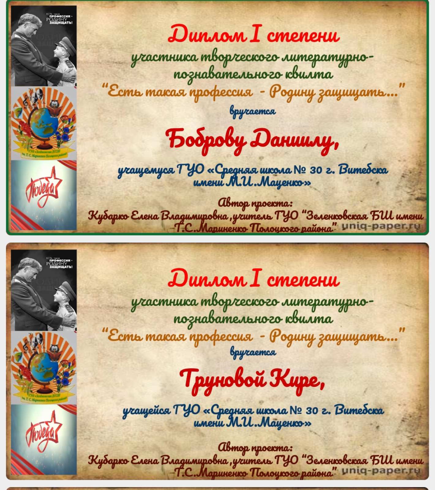 Учащиеся средней школы N30 г.Витебска накануне Дня Победы поздравили ветеранов и одиноких престарелых людей: Гракову Н.Ф. — руководителя организации бывших малолетних узников, Котова А.Ф. — ветерана Вооруженных сил Республики Беларусь, Черникову Р.А. — малолетнюю узницу, Булычеву Р.А. — одинокого пожилого человека.