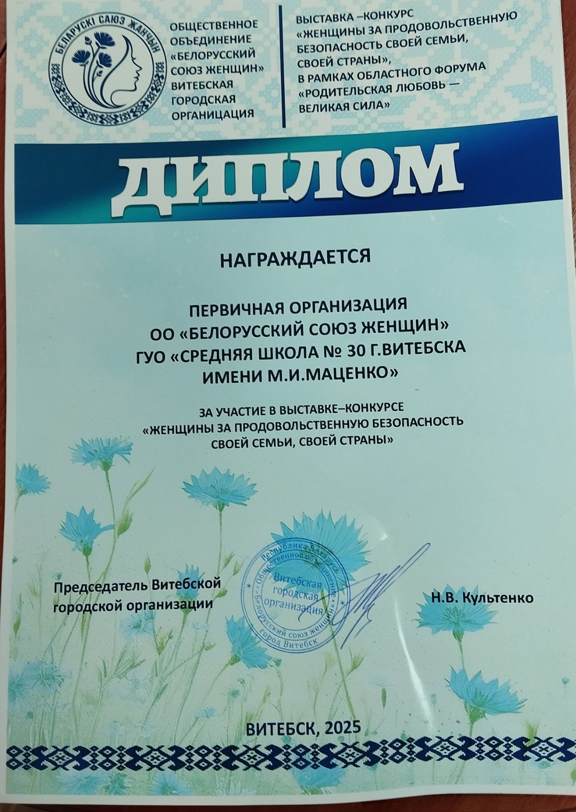 Первичная организация БСЖ учреждения образования награждена дипломом за активное участие в выставке-конкурсе «Женщина за продовольственную безопасность своей семьи, своей страны»