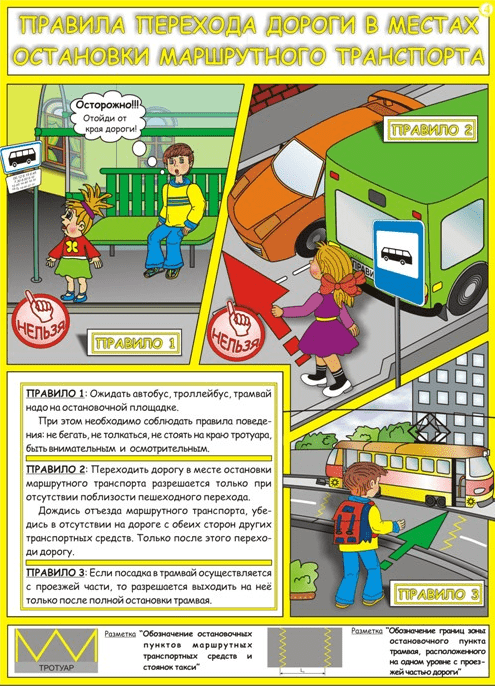 • При выходе из автобуса на нужной остановке, следует обходить его сзади, перед этим убедившись, что за ним не едет другой транспорт.