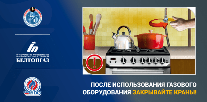 - по окончании пользования газом закрыть краны на газоиспользующем оборудовании и перед ним, а при размещении баллонов внутри кухонь дополнительно закрыть вентиль баллона;